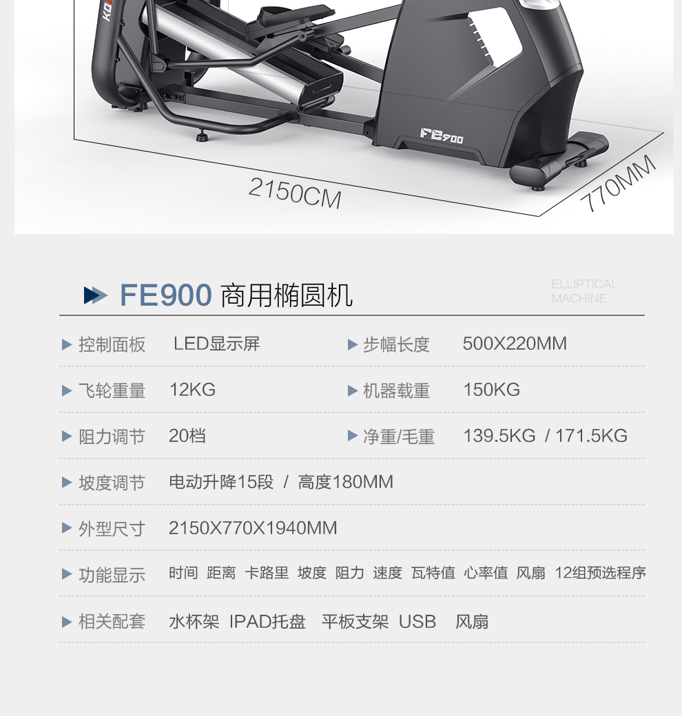 | 飞轮重量:12KG | 坡度调节:电动升降15段 | 净重/毛重:139.5KG/171.5KG | |