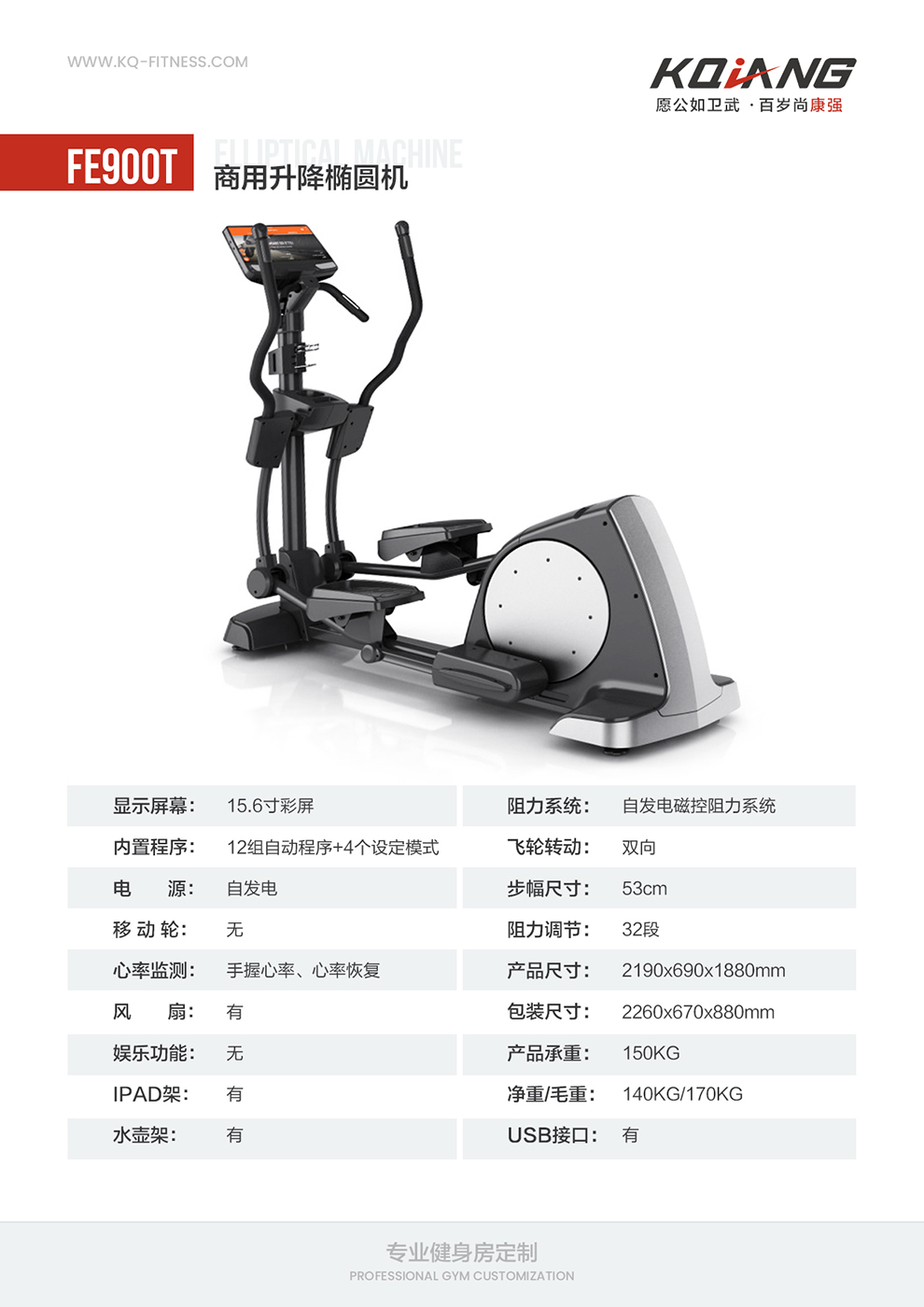 | 阻力控制:1-32段ENS自发电电磁系统 | 占地面积:2190*690*1880MM | 扶手:带有手握心跳和心率恢复功能 | 载重:150kg |